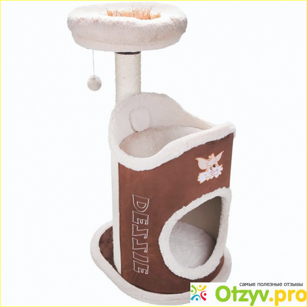 Расцветка практичная - коричневый с бежевым, сам домик-когтеточка занимает мало места и в интерьере смотрится очень даже симпатично! Материалы, из которых когтеточка сделана, плотные, хватит надолго, конструкция качественная, стоит устойчиво, если ваш питомец разыграется. Сама ткань приятная на ощупь, экологически безопасная - не пахнет синтетикой или клеем, все швы ровные, хорошо прошиты. В целом дом-когтеточка очень уютный, комфортный, удобный для животного - спать кошка может и внизу, в закрытом домике, и наверху, на его крыше, точить когти хоть вытянувшись во весь рост - высота позволяет, а маленький пушистый шарик, подвешенный сверху, доставит вашего питомцу много радости! Когтеточка, считаю, обязательный предмет интерьера в семье, где живет кот, без нее не сохранить ни мебель в доме, ни обои! А модель «Руан» от фирмы DEZZIE - отличный вариант, который помимо своего прямого назначения еще и спальное место! Доверие и симпатию у животного вызывает сразу, ну очень хорошая модель!)