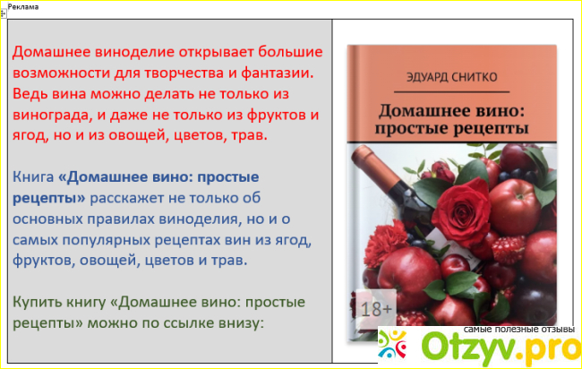 В это книге простым и понятным языком рассказывается о домашнем виноделии. В первой части книги- об основных общих правилах изготовления вина, а во второй части книги приведены популярные рецепты из всех возможных фруктов, ягод, и даже овощей, цветов, трав и прочего сырья. Для меня было открытием, что вино можно делать из овощей, трав и цветов, из этой книги я впервые узнал, что для приготовления вина абсолютно не подходят обычные хлебопекарные дрожжи. Вообще узнал много нового, и теперь делаю по приведенным в книге рецептам отличное домашнее вино.