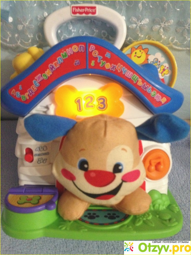 Домик имеет очень много веселых песенок, которые озвучены очень приятным голосом, как , в принципе и все игрушки от этого производителя, есть обучение английскому языку, что помогает малышу с самого детства с ним знакомится, чему лично я очень рада!