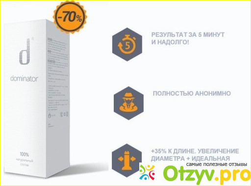 Dominator представляет собой средство, которое состоит из целебных и полезных масел, афродизиаков природного происхождения, а также полезных компонентов. Это средство позволяет мужчине увеличить размер его достоинства до максимально возможного размера. Для того, чтобы данное средство действовало, его необходимо нанести на пенис и слегка втереть, и делать это необходимо перед сексуальным контактом. Действие спрей оказывает сразу. Это становится сразй заметно, так как эрекция у мужчины становится каменной, а также пенис увеличивается в размере и в объеме. Для здоровья мужчины спрей полностью безвреден, так как это процесс природный. После того, как мужчина применяет спрей, каждый раз, его пенис будет постепенно увеличиваться. И после нескольких месяцев регулярного применения, половой орган может увеличиться в размере до пяти сантиметров, и в диаметре до двух сантиметров. Такие изменения в размере пениса позволяют наладить интимные отношения, что у нас и произошло. Сейчас у нас в потели полный порядок, выносливость у мужа стала намного больше, он может часами заниматься сексом и не уставать. Так что, спрей м 16 это отличное средство не только для мужчин, но и для нас - прекрасных дам.