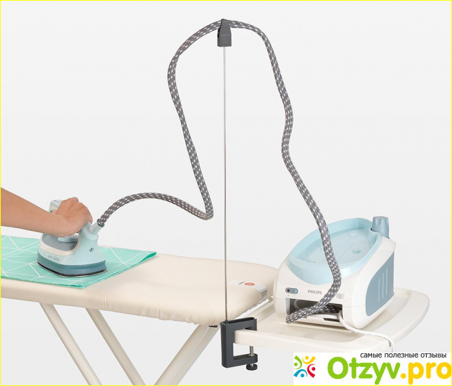 Производитель установил на гладильной доске держатель для шнура – высокое гибкое приспособление, напоминающее антенну с разъёмом на верхней части. Провод, помещённый в этот разъем, уже не опускается, не попадает на чехол доски и не мешает гладить бельё.
