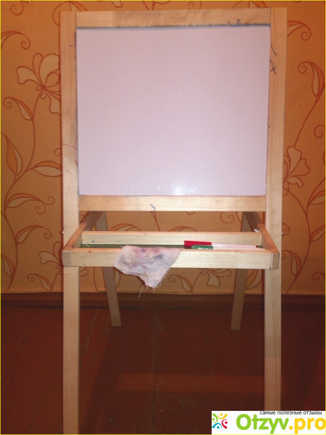 Мольберт устойчивый, удобный. Двухлетнему ребёнку немного высоковат, но всё равно рисовать нам очень на нём удобно. Для нас эта игрушка, а точнее, полезное приспособление для развития творчества стало очень нужным и и любимым. В мольберте есть поддоны, куда можно положить фломастеры, тряпочки и мелки. Очень жаль, что нет никакого поддона или корзины, куда можно было бы складывать магнитики. Хоть они в комплекте и не продаются, но собираюсь купить для дочки набор букв и цифр. Жалко, что производитель не продумал место для хранения магнитов, раз уж он предусмотрел магнитную доску. И ещё бы в идеале, было бы очень красиво, если бы мольберт всё же был лакированным.