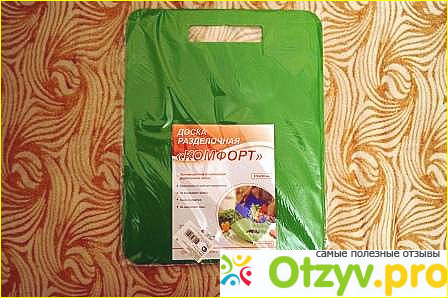 Выпускает её наша страна Россия, город Москва, ОАО "Полимербыт". Она имеет не совсем стандартный, но очень удобный размер 370 на 290 мм, изготовлена она специального гнущегося пластика, то есть она гибкая. Эта первая гибкая разделочная доска, во всяком случае у нас, на нашей кухне. Цветовая гамма их разная, у нас она зеленоватого цвета. Своей гибкостью данная доска намного выигрывает перед другими досками, её легко можно согнуть по бокам и направить порезанные овощи прямо в суп или салат. В согнутом состоянии она представляет собой желобок, по которому и скатывается её содержимое в нужную вам кастрюлю или тарелочку. Надо заметить, что обе поверхности на данной доске рабочие, сама доска не впитывает запахи, не царапается от ножей и даже их не тупит. Вот такую замечательную доску мы приобрели, чего и Вам желаем. Стоит она у нас около 90 рублей, одним словом недорогая и полезная вещь для любой кухни и вполне оправдывает своё название "Комфорт".