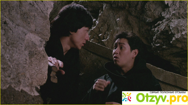 Но все же все внимание приковано именно к Джеки Чану, благодаря которому фильм наполнен интересными и зрелищными драками в стиле кунг-фу! Ох уж это молодой Джеки! Хотя он и сейчас выполняет большинство трюков без каскадеров, но в «Доспехах Бога» они особенно внушительные! Чего только стоит его прыжок со скалы на огромный парашют?!