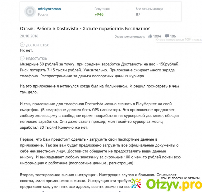 Перейдем на форум отзывов "Отзовик", который пользуется популярностью и чистой репутацией уже довольно много времени. Здесь пользователь mirkynroman заявляет о том, что имел опыт работы там. Унизительно маленькая зарплата - 50 рублей за точку, и при этом заработок доставистов - 150 рублей.