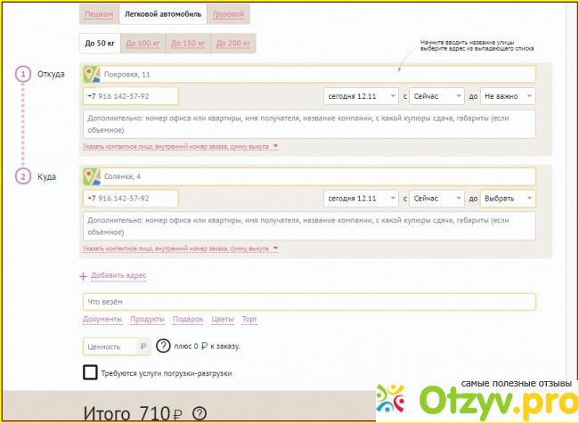 Вы выбираете тип доствки: пешком и автотранспортом (грузовой или легковой автомобиль). Здесь нужно указать адрес, куда нужно доставить ваш товар и калькулятор сам посчитает стоимость доставки.