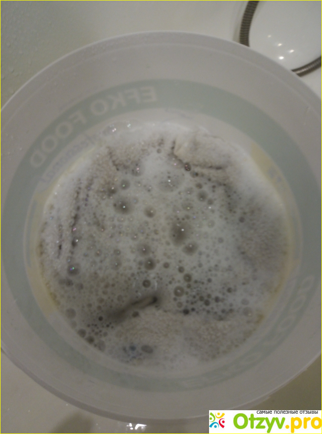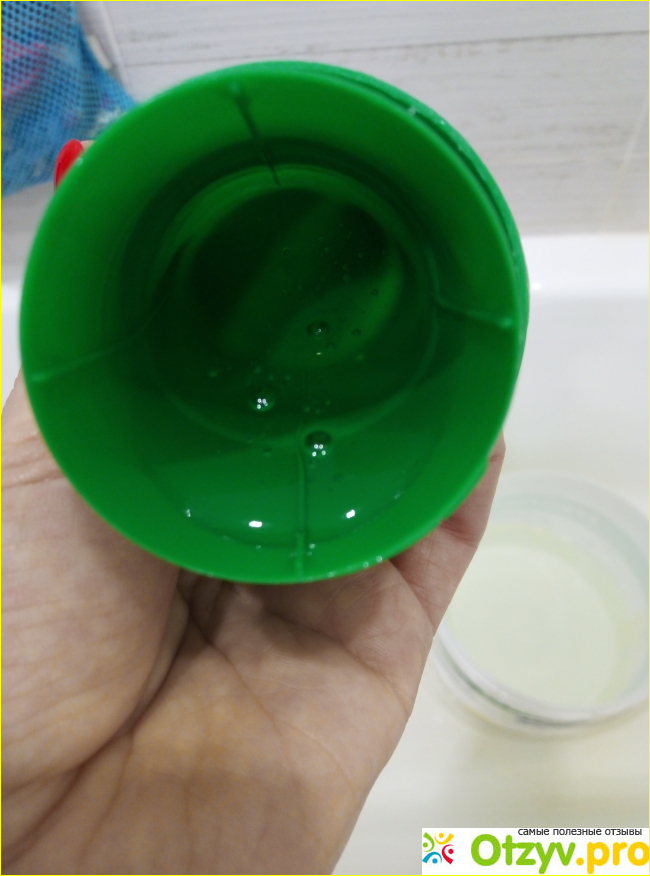 Как только купила гель, решила перестирать полотенце, оно у нас пока одно, поэтому стирать решила руками, да и было оно чистое, поэтому я его замочила в воде с моим новым гелем. Посмотрите, так как в составе нет красителей, гель совершенно прозрачный.