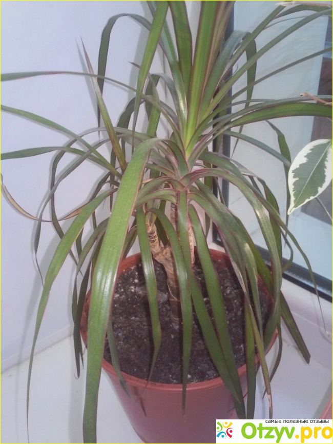 И вдруг в один прекрасный день, мне подарили Драцену муж и дочь. Я была очень рада и счастлива, что наконец то моя мечта сбылась. Драцену, которую они принесли была маленькой крошечкой, такой миленькой. Я начала изучать разную литературу о Драцене, читала как ухаживать за ней, как поливать, куда ставить, как размножать. Все изучив, я поняла, что Драцена неприхотливое растение, но очень любит свет и солнце, но от прямых солнечных лучей, ее нужно оградить. А если света будет мало, то листья будут терять свой естественный окрас. Драцена влаголюбивое растение, но переливать ее нельзя, лучше не долить, чем перелить. Хоть и везде написано, что поливать Драцену надо раз в три дня, но мы с моей Драценой поладили, только тогда, когда, я ее стала поливать раз в неделю, причем и зимой и летом. Вот так мы и стали жить с моей Драценой в мире и любви. Все было хорошо, но через три года жизни у нас Драцены, вдруг смотрю она сохнет, желтеет, и опадают листья. Все думаю погибает, как спасти Драцену не знаю. Листья начинают желтеть с самых кончиков и постепенно до самого основания, а потом опадают и не один- два, как было раньше, когда все было нормально, а все массово. В результате листопада, на моей пальме осталось по четыре или пять листиков на каждой веточке. Я не знала, что делать, мысленно попрощалась с Драценой. Смотрю и у этих последних листиков кончики пожелтели. И почему то мне пришла в голову мысль, обрезать эти пожелтевшие, сухие кончики на листьях. Я взяла ножницы и обрезала на каждом листике сухой кончик. И почему то это все изменило, листики дальше желтеть и сохнуть не стали, а наоборот полезли новые и моя Драцена воскресла и до сих пор радует нас своей красотой.