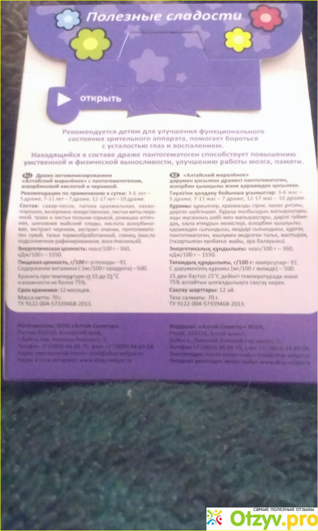 Всем моим читателям доброго времени суток. Дети любят сладости, но родители должны позаботится, о том чтобы дети получали пользу. Поэтому я приобретаю для своего ребёнка вместо конфет полезное драже под названием " Алтайский Маралёнок" Черника.