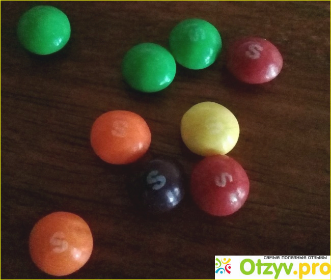 Драже маленького размера, ярко окрашены, имеется логотип : буква " S".
