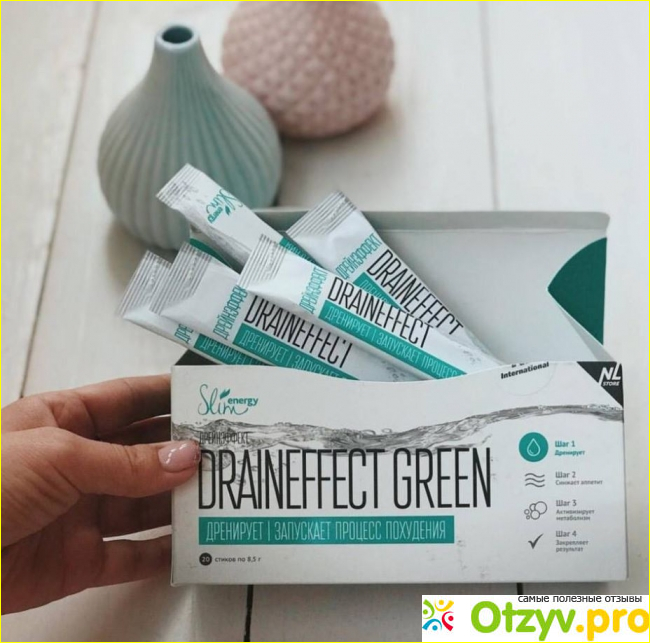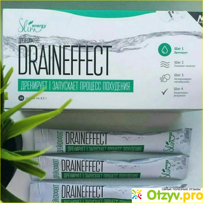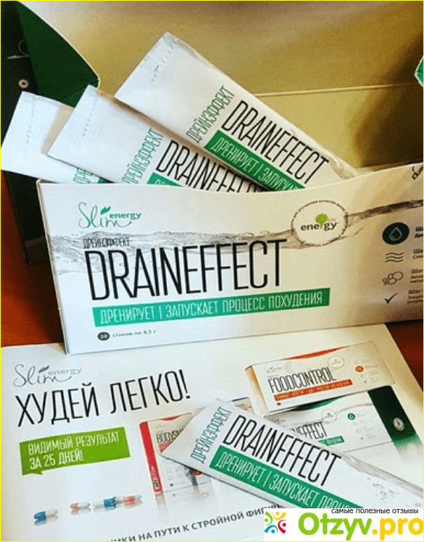 DrainEffect является стартовой ступенью полного цикла системы Энерджи Слим, которая дает отличные результаты в процессе похудения, улучшить формы фигуры и привести свое тело в порядок без сложных диет и вредя для организма. Данное средство обеспечивает полный запуск организма на очищение и позволяет очистить его от всех накопленных токсинов и лишней жидкости. Процесс очищения происходит на уровне печени, почек и кишечника. Данное средство позволяет оказывать отличное мочегонное действие и дренирует системы организма. В результате чего, вся жидкость, которая застаивалась в организме вместе с токсинами теперь выходит. Это говорит о том, что жидкость выходит не просто из организма, но даже из клеток жира.
