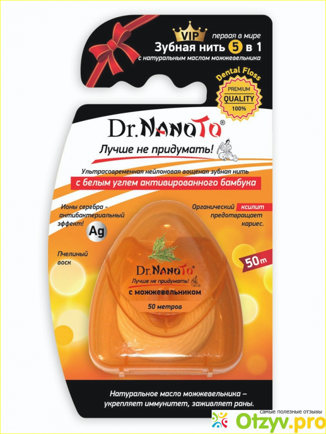 Моя новинка это нить 5 в 1 с натуральным маслом можжевельника от Dr.NanoTo. В рулетке 50 метров и стоило мне это приобретение 250 рублей. Довольно экономично с учетом приличного метража. Это современная вощенная нейлоновая нить с белым углем активированного бамбука. Содержит органический ксилит, можжевельник, пчелиный воск, ионы серебра и другие активные ингредиенты. Благодаря этому происходит не просто вычищение мягкого налета, но и восстановление.