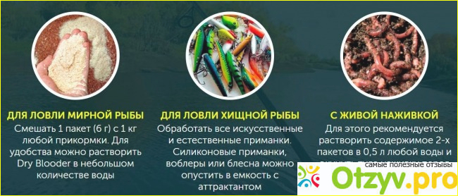 Dry Blooder именно такой современный препарат для привлечения рыбы. Это не синтетический продукт, а высушенная кровь. Поэтому он не вредит водоему и самой рыбе. При использовании такого состава больше не понадобится прикормка, не придется варить кашу или варево из отходов, смешивать картошку с хлебом. Поскольку приманка не только привлекает рыбу, но и побуждает ее хватать наживку с аппетитом.