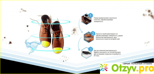 8. Действую, спрей обеспечивает невосприимчивость вещей и обуви к загрязнению и влаги в течение всего сезона, то есть на протяжении не менее 3 месяцев.