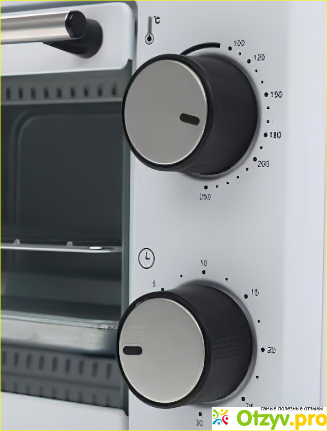 Всё управление механическое, сверху крутилкой устанавливаем температуру от 100 до 250° с интервалом в 10°. В инструкции, которая идет вместе с печкой, написан предел нижней температуры в 60°. Вполне возможно, так как регулятор сползает чуть-чуть ниже отметки в 100°. Ниже располагается таймер, который позволяет довольно точно устанавливает время в пределах получаса. Он здесь механический и вы слышите небольшое бряканье, когда он доходит до конца. В комплекте вместе с печкой идут духовка и противень (его размеры составляют в ширину 14.5 см в длину 20.5 сантиметр).