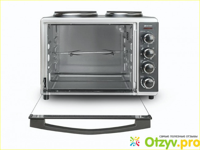 на духовке фирмы Ritfort KT-1703 которую довольно долго и тщательно я выбирала в интернет магазине. Производитель указывает что это духовка, но если разобраться, то это скорее электро плита. Только небольшого размера. На ней можно и печь и борщ сварить. Фирма kitfotr довольно известна. Она выпускает кроме кухонной техники еще и средства для уборки помещений, Это и пылесосы и пароочистители. Итак, начну свой рассказ по порядку. Духовка пришла в большой картонной упаковке. Когда я ее открыла, по бокам для большей прочности, был пенопластовый уплотнитель. На коробке была изображена сама печь и описаны ее основные характеристики. В комплекте вместе с печью шел противень, термо ручка для того чтобы противень было легко извлекать из духовки, решетка, а также ручка для вертела и сам вертел, позволяющий приготовить мясные продукты, на гриле с румяной корочкой. Очень удобная штука. На вертеле получается очень вкусная и сочная курица приготовленная целиком. И подробная инструкция по эксплуатации. А сейчас немного о размерах печи ширина сорок пять сантиметров, Высота тридцать девять сантиметров, Глубина тридцать семь сантиметров. А вес самой печи 9 килограмм. Мощность духовки тысяча шестьсот ватт. Сама печь черного цвета, , но дверца у нее прозрачная, что помогает наблюдать за процессом приготовления пищи. Внутри печи есть два тена сверху и два тена снизу. При нагревании они становятся ярко-красного цвета. На боках духовки есть специальные выемки для решетки, или противня. Еще есть подсветка, и вал для вращения вертела.