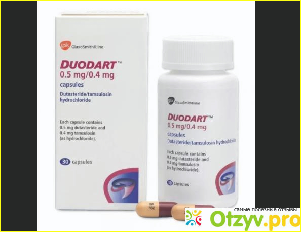Дуодарт - лекарство, которое содержит два активных вещества: дутастерид ( 0,5 мг ) и тамсулозин ( 0,4 мг ). Он принадлежит к группе лекарств, называемых антагонистами альфа-адренорецепторов ( также называемыми альфа-блокаторами ). Дутастерид блокирует действие ферментов 5-альфа-редуктазы. Эти ферменты превращают тестостерон в 5-альфа-дигидротестостерон ( ДГТ ), который отвечает за гипертрофию простаты. Блокирование этого фермента предотвращает дальнейший рост простаты. Тамсулозин блокирует альфа-рецепторы в простате и мочевом пузыре, расслабляет гладкие мышцы простаты и мочевого пузыря и облегчает мочеиспускание. Из-за таких эффектов он используется при лечении доброкачественного увеличения простаты ( доброкачественная гиперплазия предстательной железы -BHP ) и для предотвращения задержки мочи.