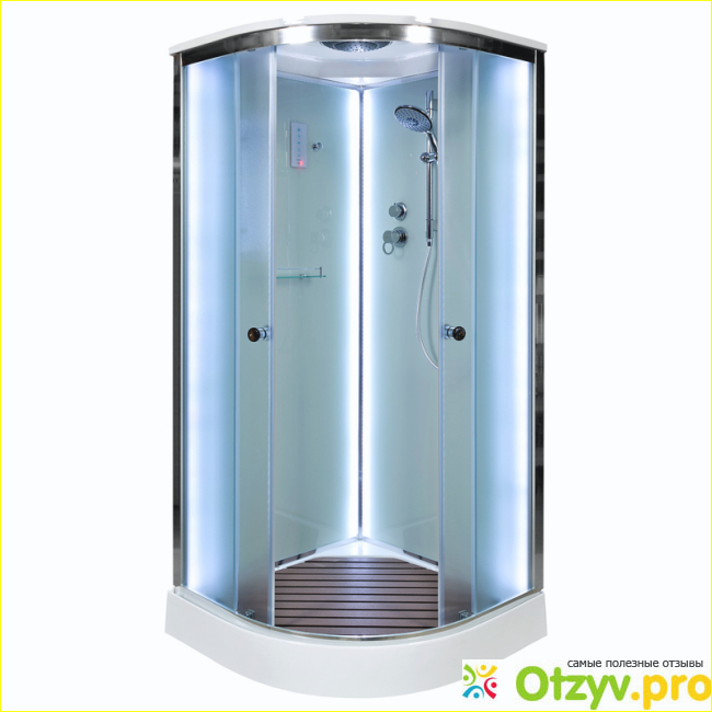 Очень интересное решение поставить обрешетку на дно акрилового поддона, так и подскользнуться просто нет шансов). Кабина хоть и четверть круга но все равно достаточно вместительная. Хорошо что она не прозрачная, а матовая. Порадовало наличие зеркала и полочки для шампуней, гелей и прочего, есть еще радио для тех кто любит слушать и петь песни в душе. Доволен душевой кабиной. Работает прекрасно!