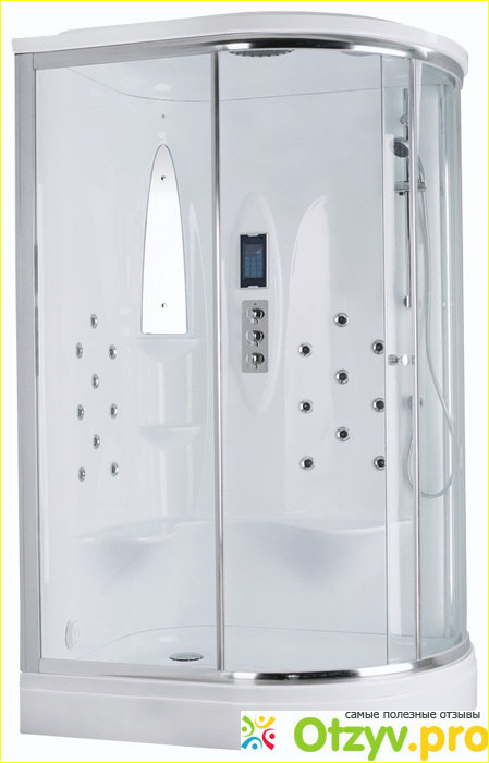 наша очень стильная, на окнах и стенках красивый узор. Сенсорная панель с настройками, сенсор в душе отдельное впечатление для людей которые предпочитали только ванны. Вот про функции хотелось гордо рассказать. Вариантов принятия душа огромное количество, вода может литься из потолка, со стен. или можно набрать поддон и мыться в нем как в тазике :) Только глубина это действительно позволяет, можно нормально так прилечь и даже вытянуть ноги высокому человеку. Функция гидромассажа делает это вообще незабываемым опытом. Кстати настройка есть под каждого члена семьи, выбор температуры воды и прочее тоже можно сделать электронно за дополнительную плату. Очень много функций которые еще не испробовал, кстати там есть вентиляция, свет, радио :) Полный набор для уединения
