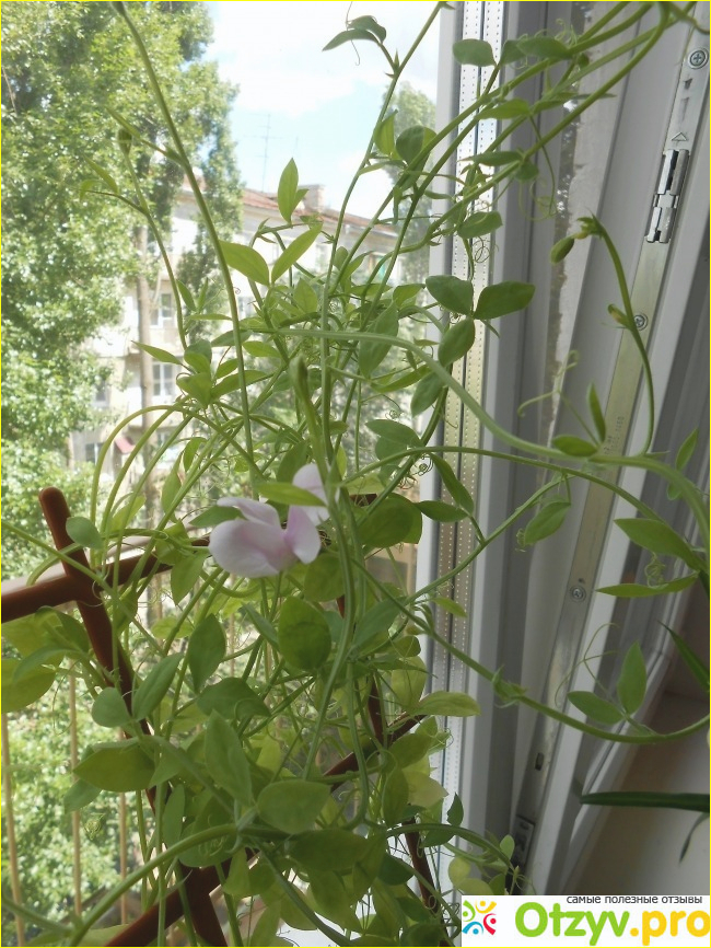 В конце марта я высеяла семена душистого горошка в торфяные стаканчики, которые оставила в комнате на подоконнике, и где-то через неделю они проросли. Несмотря на то, что за окном были заморозки, горошек рос не по дням, а по часам. Его надо было уже пересаживать в большие горшки и ставить их на балкон, но погода не позволяла это сделать. Так что растения росли в комнате, причем очень интенсивно, через месяц их пришлось подвязывать к решетке. И вот, когда установилась теплая температура, я выставила горшки с Лемингтоном на балкон. В июне он начал цвести, но не так интенсивно, как я ожидала, да и цветки были нежно-розового цвета, а не сиренового. Впрочем, меня это не слишком расстроило. Очень приятно наблюдать за цветением горошка и образованием стручков. Маленький огородик на балконе у меня получился. На следующий год обязательно снова посажу душистый горошек, для него северная сторона не критична.