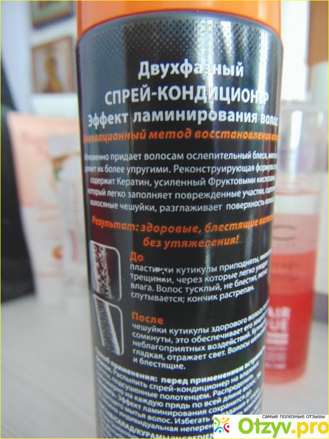 Итак, моем голову обычным шампунем, подсушиваем волосы полотенцем и наносим (распыляем) спрей по всей длине волос, про кончики волос тоже не нужно забывать. Запах у спрея очень приятный, ненавязчивый и не приторный. Распыляется хорошо. Затем можно укладывать волосы феном, или просушить естественным путем. Я использовала фен, так как торопилась на работу. Мои ощущения: волосы стали лучше на вид, легче уложились, стали немного тяжелей. Эффекта ламинирования, конечно, как такового я не заметила. Но, как кондиционер мне этот спрей понравился. Эффект ухоженных волос заметен. Использую его не каждый день, а раза три в неделю. В остальные дни пользуюсь бальзамом для волос «Золотой шелк», но о нем будет мой следующий отзыв.