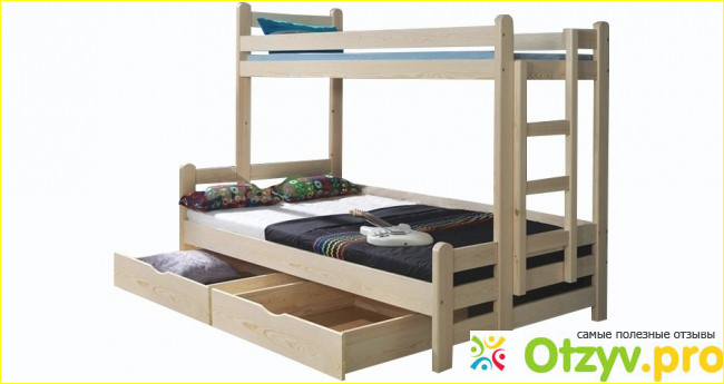 При этом получается очень компактный комплекс. Отдельный восторг по поводу лестницы. Почти на всех кроватях лесенка установлена фронтально, и нижней кровати просто загораживается часть обзора, затемненность, и чисто визуально это не приятно - ребенок как в клетке. На Орленке лесенка сбоку! Никто никому не мешает и пятками перед носом не мелькает. Снизу у нас два ящика на колесиках. Легко вынимаются, полы мыть дети сами справляются, несмотря на возраст. Один ящик у дочки, второй у сына, каждый хранит свои сокровища там, каждый сам отвечает за порядок. Хочу небольшую ремарку вставить по материалу - если металлическим чем-то задеть кровать, то появится вмятина - сосна довольна мягкая. Касательно бортов - наверху борт имеется у задней стенки, передний тоже высокий. Особенно понравилось, что они "Двойные", ребенок оттуда не выскользнет, как бы ночью не крутился во сне. Весь комплекс у нас вышел на 18 тысяч, по сравнению с другими магазинами у Letto было дешевле, в общем-то поэтому там и купили. Материал, как я сказала - сосна. Кровать у нас стоит в длинной вытянутой комнате у дальней стены. Очень компактно! Благодаря ей, мы поставили еще один стол, для младшего ребенка, чтобы он мог делать уроки, и при этом осталось место на игры.