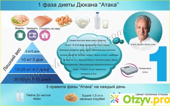 При первой фазе вы теряете максимум своего веса, длится до недели данная фаза и вам разрешено употреблять в пищу белковые продукты. Съедаем 1,5 столовых ложки овсяных отрубей. И порядка 20 минут в день уделяем физическим нагрузкам.