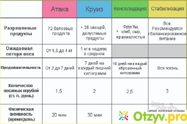 Ну и фаза Стабилизация не имеет границ, необходимо съедать по три столовых ложек овсяных отрубей и уделять внимание физическим нагрузкам - 20 минут в сутки. Тут можно употреблять любую пищу, но желательно избавляемся от калорийной пищи на протяжении нескольких месяцев данной фазы.