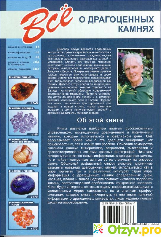 Действительно в книге в справочном формате изложены сведения о ста двадцати минералах, как общеизвестных так и менее известных широкому кругу читателей. При этом дано описание каждого камня с точки зрения минералогии, история происхождения его названия, где встречаются эти камни, сведения об их ценности и стоимости изделий. Кроме общей информации приводятся сведения о лечебных а также магических свойствах камней и их отношении к астрологии.