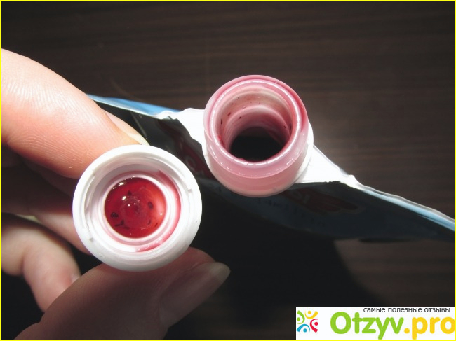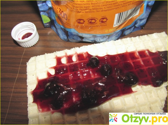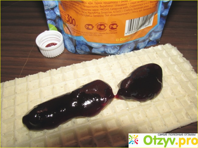 При помощи такого "носика" можно с лёгкостью регулировать необходимое количество джема. Выдавливаем столько, сколько нужно. Он достаточно густой, сам не растекается, получается вот такая "колбаска". Тут ничего толком не видно, поэтому я вам покажу ещё в размазанном виде (фото далее).