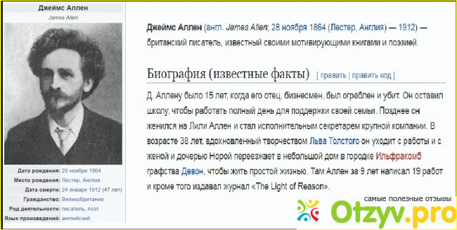 Джеймс Аллен родился еще в 19-м веке в Лондоне. И только в 1902-м году он полностью посвятил себя писательскому делу. В своих работах он часто применяли философские тезисы, которые почерпнул из Библии.