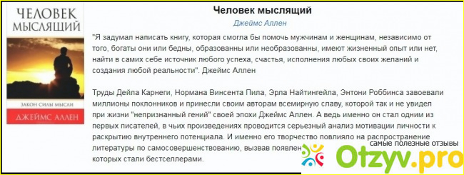 Если вам полюбились книги Дэйла Карнеги, то вы по-любому должны обратиться внимание на Джеймса Аллена. В его работах вы найдете то, о чем не писал Карнеги. Его книги дают надежду, уверенность и веру в то, что все у вас получится, что вы достигните тех высот, которых заслуживаете. Вы получите наслаждение и важные выводы для будущего успеха в этом несовершенном мире.