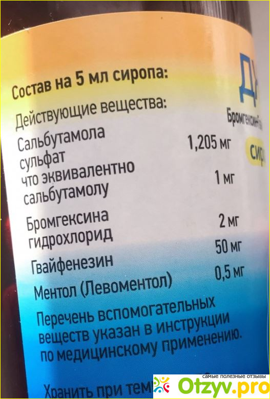 Основными действующими веществами здесь служат сальбутамола сульфат, бромгексина гидрохлорид, вайфенезин, и ментол. Остальное всё соответственно вспомогательные вещества вроде лимонной кислоты, красителей, подсластителей и так далее.