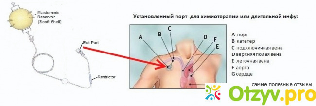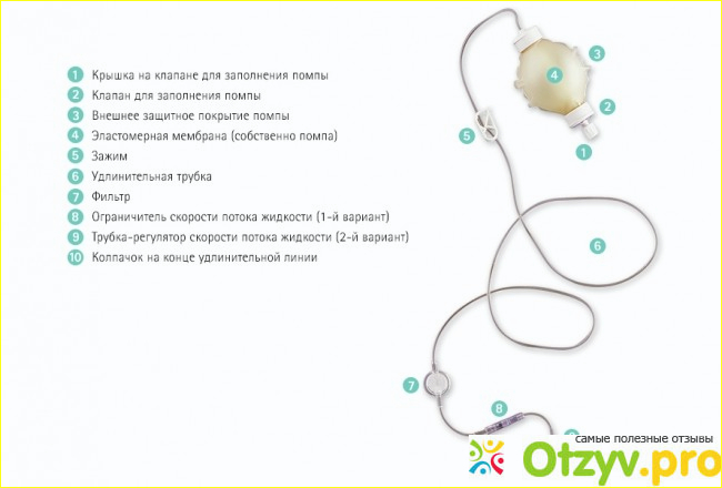 Устройство и принцип действияОсновным компонентом инфузионной помпы является эластичный баллон, который при наполнении растворами химиотерапии растягивается как воздушный шарик, а при открытии клапана, жидкость под давлением начинает вытекать. Скорость введения лекарства в вену ограничивается специальным, заранее отрегулированным дозатором и вводится в вену через специальный порт Port-a Cath или аналогичный катетер.