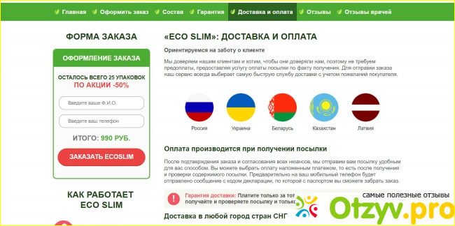 ЧТо касается интернет-магазина Eco Slim то он существует достаточно давно и вряд ли бы вывез такой большой срок, если бы обманывал. Оформление здесь довольно обычное и заурядное - запоминаются лишь зеленые цвета и не более. На главной странице нам показывают все преимущества этого препарата.