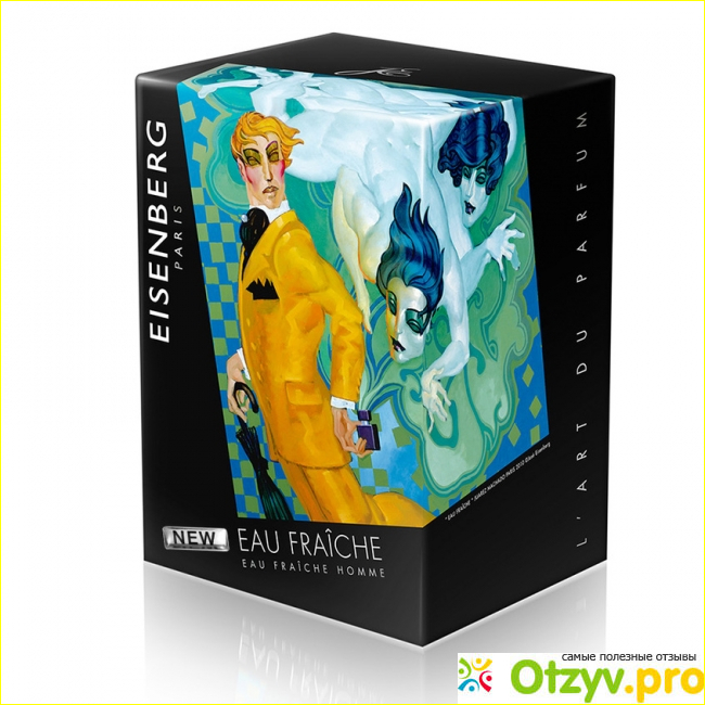 Аромат оформлен очень стильно, в духе бренда Eisenberg. На передней стороне изображена репродукция картины известного художника Жуареса Мочадо, на боковых гранях написаны цитаты. Сам флакон выполнен весьма скромно - простой куб черного цвета с надписью белым цветом. Выглядит также стильно и сдержанно, по-мужски. Стоит отметить, что все ароматы оформлены в одном ключе - и женские и мужские.