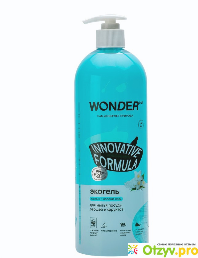 Это средство не только прекрасно удаляет жир, убирает неприятные запахи и придаёт блеск посуде, но и абсолютно безопасно для людей и природы. Суть в том, что основа всех средств Wonder Lab-биомикрогель. Для его изготовления используют свекольный и яблочный пектин, кукурузный крахмал и целлюлозу. Гель настолько безвреден, что им можно мыть не только посуду, но и фрукты с овощами. Он полностью смывается водой и уже через сутки практически полностью разлагается.