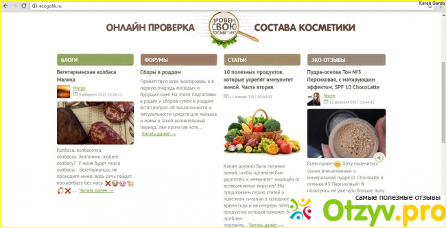 Еще одним популярным разделом на сайте является Эко-отзывы. Люди оставляют довольно подробные отзывы на сайте с фотографиями о тех товарах, которые они покупали сати. Здесь часто бывает представлена разборка различных составом, общее описание средства и ощущения от его использования. Благодаря этому разделу можно легко понять, что из себя представляет какой-то конкретный продукт и стоит ли его вообще покупать или нет.