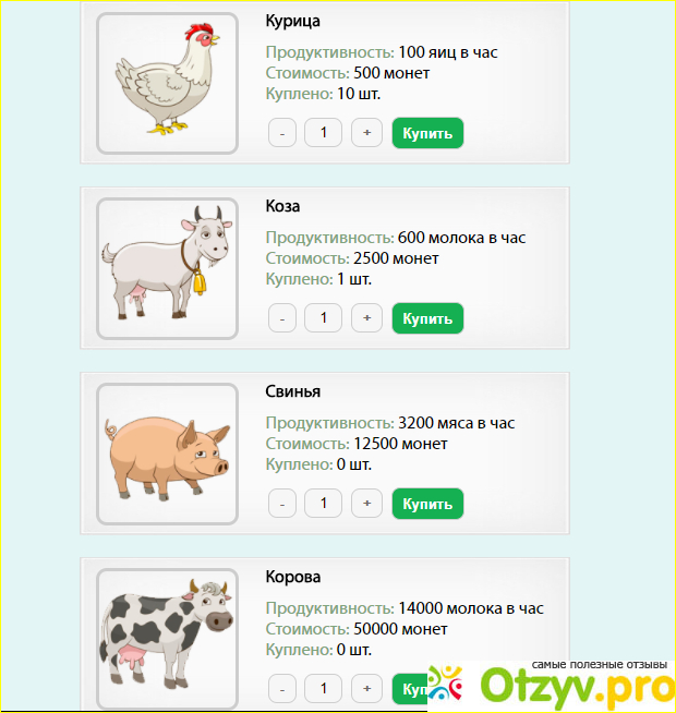 И так после регистрации вы получите бонус ( в виде 1000 серебра) на который вы купите первое животное (курица). Эта курица будет вам ежечасно нести яички, в дальнейшем вы их будете обменивать на серебро, а серебро на деньги. Выглядит это вот так.