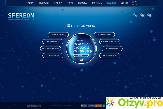Структура ресурса легкая, все просто и находится под рукой. После простой регистрации, мы попадаем в личный кабинет, где можно купить "сферы".