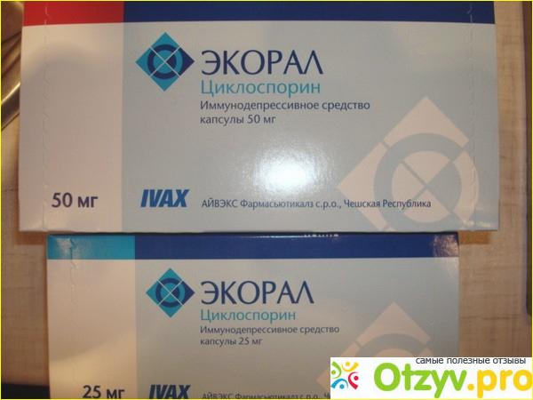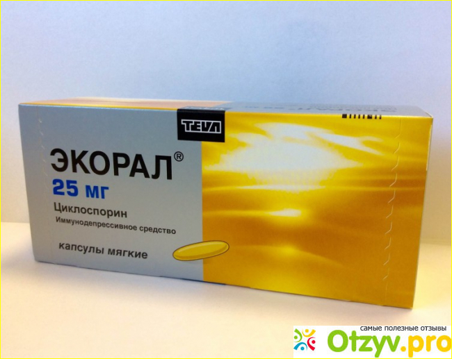 Препарат Экорал также относится к категории иммунодепрессантов, является циклическим полипептидом (ингибитор кальциневрина) , активным веществом здесь служит циклоспорина в дозировке по 25 мг. Выпускается средство в форме мягких капсул. Данная категория препаратов не имеют полного описания механизма их воздействия на организм, но считается, что они ингибируют Т-лимфоциты (клетки иммунной системы), блокируют синтезирование кальциневрина, то есть белка, который является частью иммунной системы.