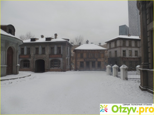 К сожалению во время экскурсии посетителям предоставляется очень мало времени для осмотра и съёмки улиц старых городов (одна улица Петербурга и одна улица Москвы). После прогулки по улице нас отвели в здание. Там интересно. Нам показали сцену из фильма "Вий" (актеры ненастоящие, но все равно страшно). Экскурсия на этом закончилась. В здании что-то вроде музея. Выставлены фотоаппараты и кинокамеры, костюмы из разных фильмов. Есть магазин сувениров, а вот буфет найти не удалось.