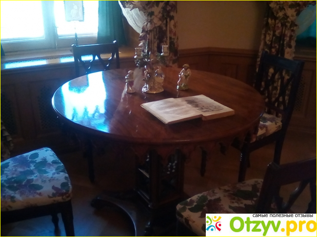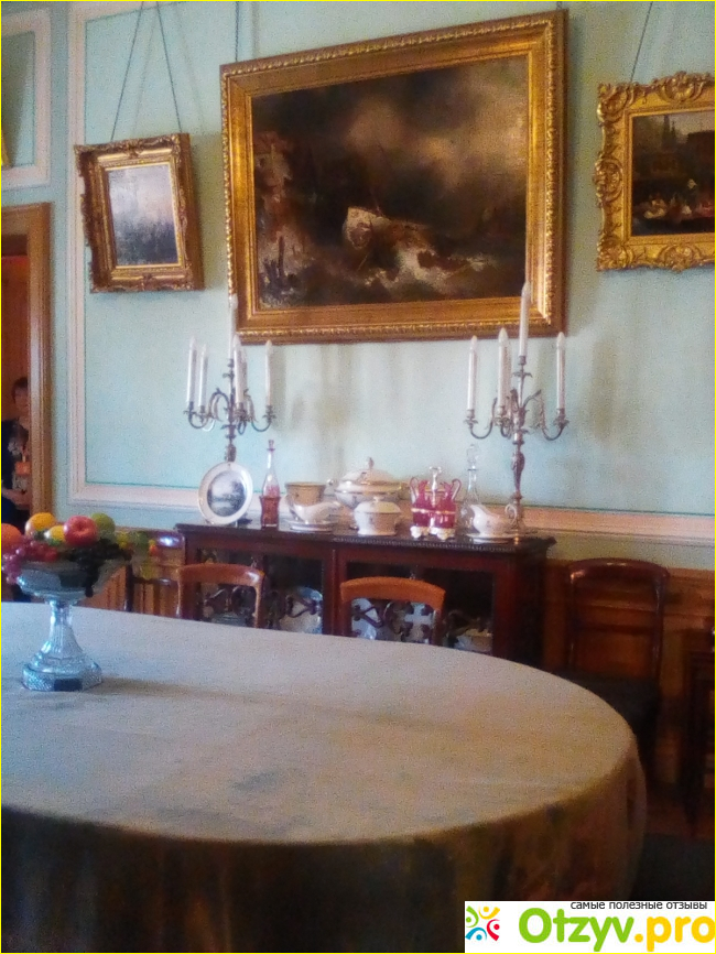 Камин также присутствует и здесь, справа небольшая ширма. За ней обычно трудились работники кухни и прислуга, а ширма нужна для того, чтобы гости не видели, как она там хозяйничает. Обеденная зона, где принимала трапезу царская семья. Здесь же мы сможем увидеть посуду того времени.