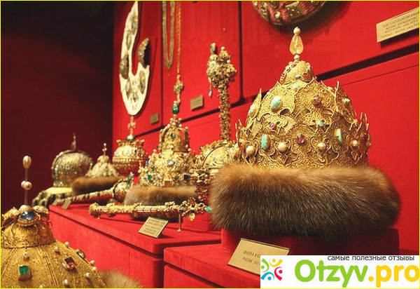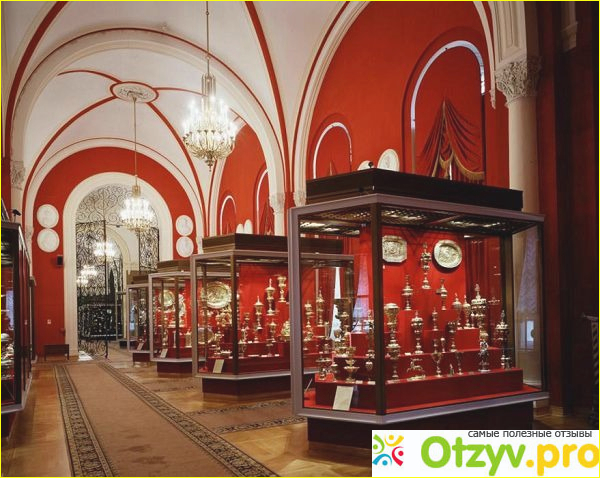 Осмотр начинают со второго этажа. Тут можно увидеть изделия русских мастеров, которые относятся 12-18 векам, но в основном представлены изделия, датируемые 15 и 16 веками. Много всякой интересной посуды, в том числе из серебра и золота, драгоценных металлов и камней. От всего этого разбегаются глаза, особенно если вы сюда попали впервые. Очень интересно посмотреть самовар, который является первым в России, а также витрину Фаберже с яйцом часами, яйцом корабликом и яйцом поездом. Во втором зале можно увидеть брачный венец Пушкина и Натальи Николаевны.