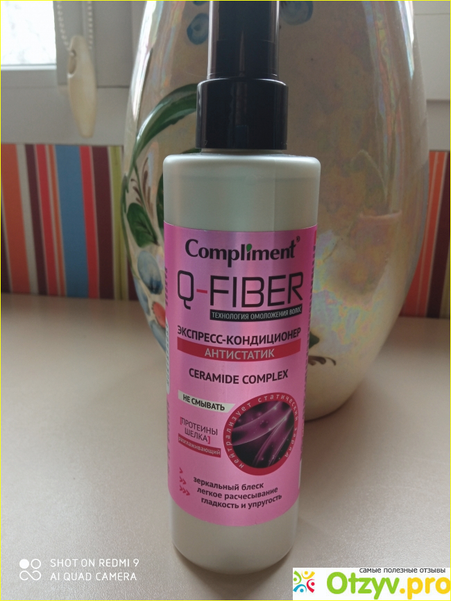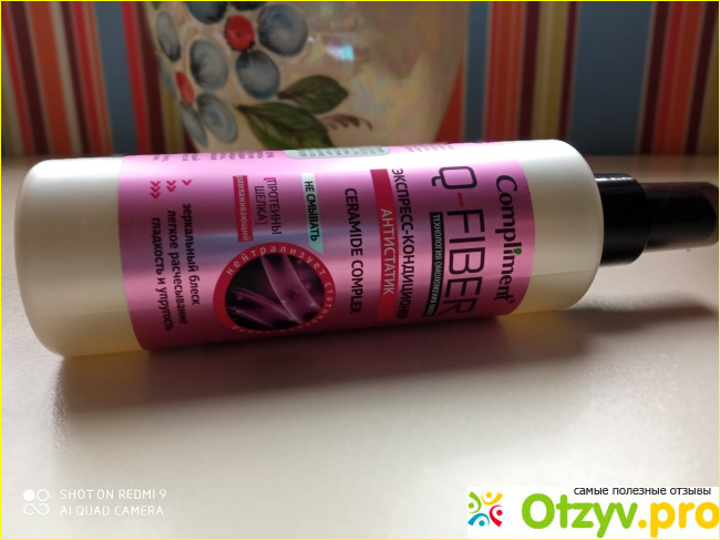На полке магазина в масс маркете заметила экспресс-кондиционер. Его позиционируют как антистатик с керамидовым комплексом (своего рода защита волос от вредного воздействия плойки, фена и тому подобное), косметическая линия Q-Fiber бренд Compliment.