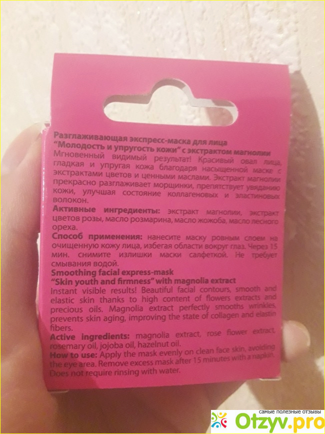 В составе ничего криминального – минимум «вредностей», указаны множество экстрактов и масел. Если намазать минут на 15 на лицо, то я не ощущала ни покалываний, ни жжения.