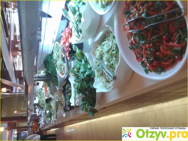 Обед очень богат на разные гарниры и салаты. Каждый день было примерно до 10 салатов, 5-6 гарниров (рис с овощами, картошечка фри или "по-селянски" и т. д.). Было очень много разного мяса, попробовали и индюка, и ягненка, и рыбу разную. Также 2-3 супчика было, ну и, конечно, много-много сладкого (и выпечки, и фруктов). Все очень вкусно, даже Оле понравилось.