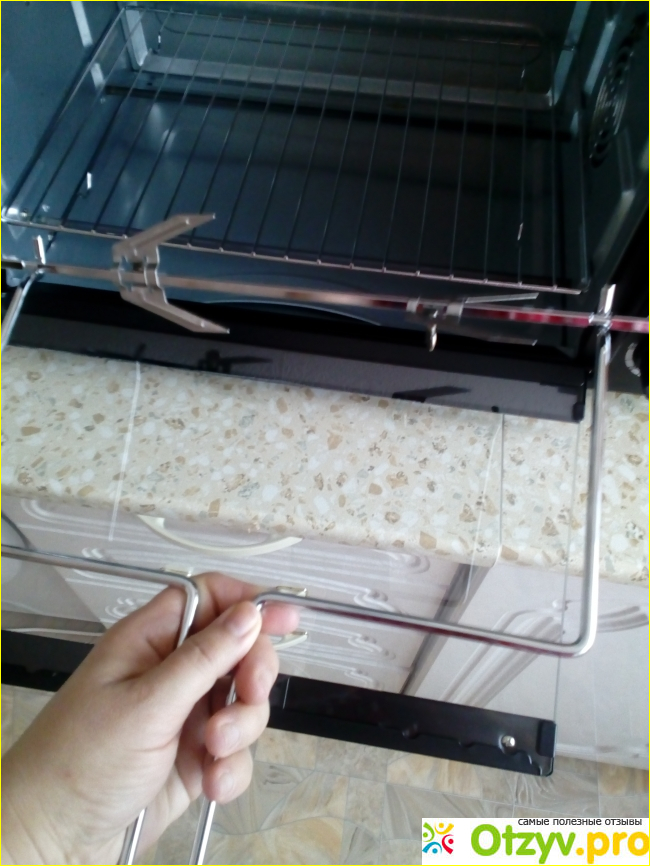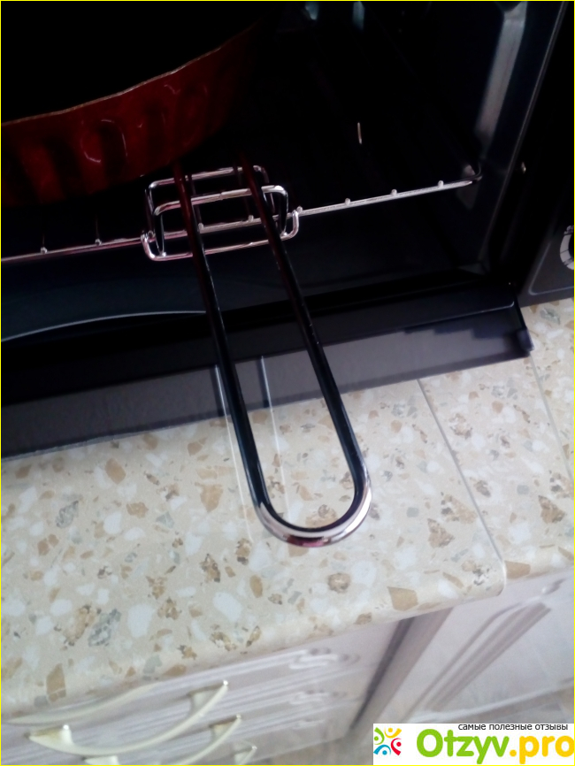 У духовки есть ещё одна отличительная черта - это использование вертела. На вертеле можно приготовить и курицу, и любой кусок мяса (говядины и свинины). Нужно вынуть один зажим для вертела, затем насадить продукт на вертел до зажима и закрепить второй зажим. Когда всё будет подготовлено, нужно поместить концы зажимов в углубления духовки (на боковых стенках внутри), убедившись, что они плотно установлены.