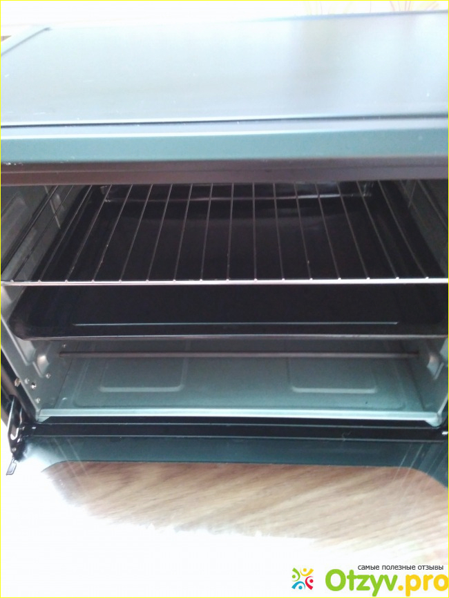 В комплектации к мини печи идет противень и решетка. На панели три крутилки, которые регулируют: температуру, время и подогрев (низ, верх или низ/верх).