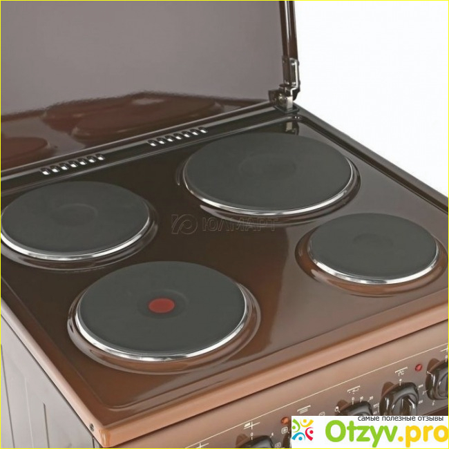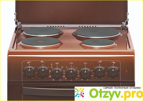 Сразу же нам понравился внешний вид электрической плиты, полностью эмалированная поверхность в коричневом цвете. Также впечатлил и объем духовки, который составляет 52 литра. Имеется также таймер и звуковое предупреждение, отдельный откидной ящик для складирования посуды.